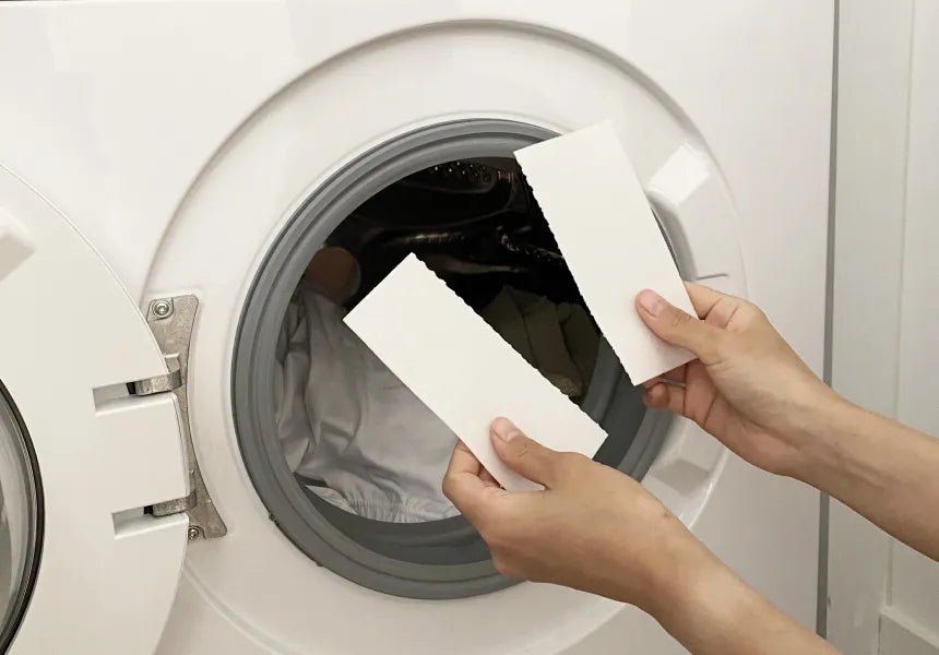 - Placez une feuille dans le tambour : Pour un lavage standard de 4Kg, utilisez une feuille entière. Pour une lavage de 8kg nous conseillons de déposer 2 feuilles de lessive.